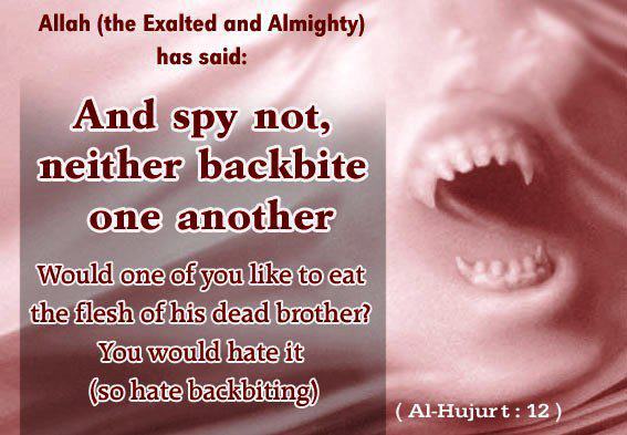 “And spy not, neither backbite one another. Would one of you like to eat the flesh of his dead brother? You would hate it ( so hate backbiting). And fear Allah. Verily, Allah is the One who accepts repentance, Most Merciful”. (Quran 49:12).
