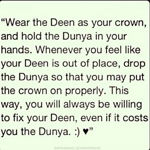 Sometimes you know people achieve a lot of success. Like new car, great job, beautiful wife/husband etc. If we don`t use these things to make our akhirah better, they are of no use. For instance, you use that nice car and go to mosques nearby and far away, to join the salah and other of their activities. The same car can also be used to go clubbing at parties. You have this great job, where you are making a difference by helping people in need. Or it could cause you to work that you forget the salah in the day. You may have a beautiful wife/husband that may treat you like a treasure, but are they making you come closer to Allah or making you skip the salah and other important obligations you have as a muslim/muslimah. Your spouse can be your ticket to hell or jannah. It`s in your own hands. Are you making choice that bring you closer to Paradise, or are you too much occupied in this world. We are not going to be here forever. Are you going to choose deen over dunya or dunya over deen? What you choose today, is going to affect the rest of your life, and maybe eternity. Be wise ❤ ❤