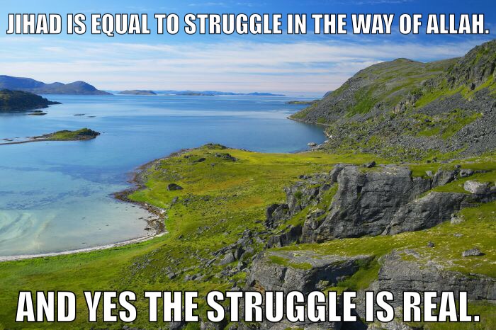 Jihad is equal to struggle. To struggle in the way of Allah. Struggle to be good with your inner self. Struggle to do righteous deeds. Struggle to be good to family, friends and kin. Struggle to remember Allah. Struggle to obey Allah. Struggle to speak good. Struggle to protect ourselves from bad matters (lying, backbiting, slander). Struggle to make our conduct good. Struggle to correct our hijab, modesty and control over our private part. Struggle to keep our soul, heart and body clean and pure. Struggle to get rid of arrogance and bad qualities. Struggle to support good and speak against wrongdoers. For the real practising muslims. The struggle is REAL. All this is jihad, to struggle in the way of Allah, to become a good practising muslim. Ya Allah, grant us to win our biggest jihad. Aamen. The struggle we fight with our own self (nafs) every day. Aamen.