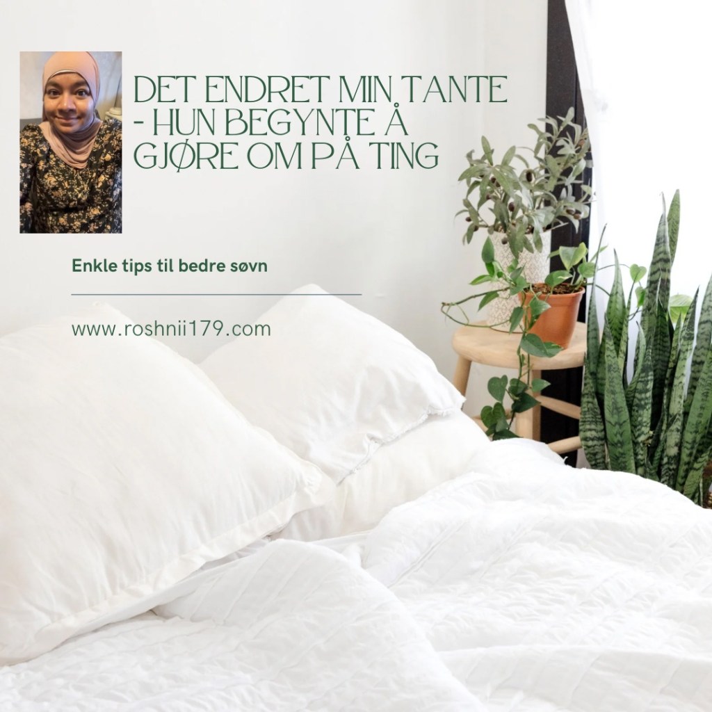 Jeg har en tante som veksler mellom å bo i utlandet og bo i Norge. Hun fortalte at hun i perioder kunne sove veldig dårlig. Det ble så ille at hun snakket med legen sin. Legen hennes spurte henne, hva hun bruker tiden sin på? Hun er hjemmeværende, så hun levde ikke veldig aktivt liv. Legen foreslo for henne å være så aktiv i løpet av dagen at kroppen hennes blir sliten. Han mente at når kroppen er sliten, vil den lettere sove bedre på kvelden. Det endret min tante. Hun begynte å gjøre om på ting i skapene, vaske gardiner og endre innredning i hjemmet sitt. Det hjalp på søvnen. På slutten av dagen ble hun sliten, og sov veldig godt.
